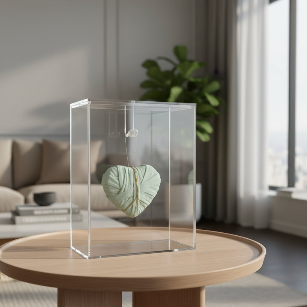 Design leve e versátil: a caixa acrílica valoriza o coração e se adapta a diferentes estilos de decoração.