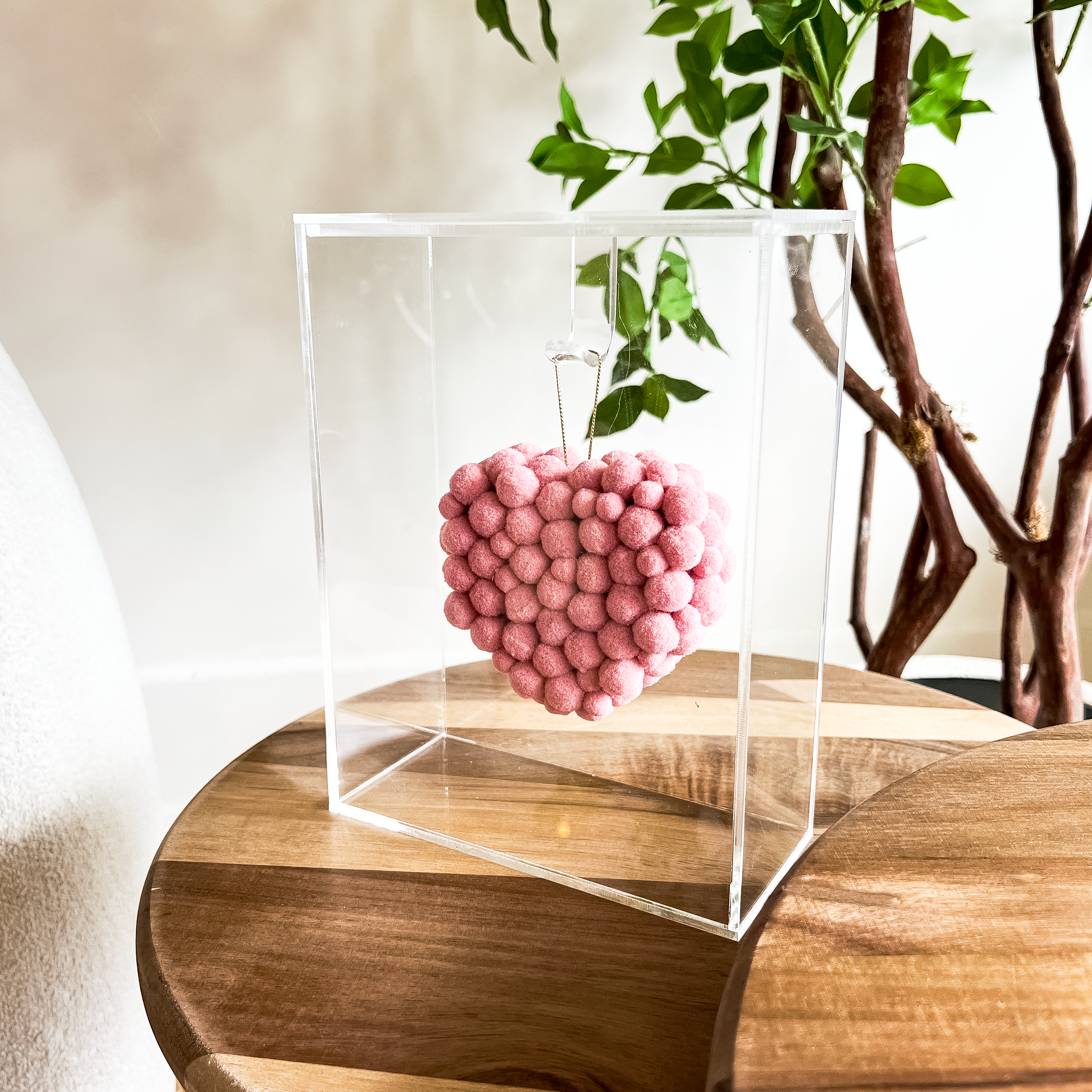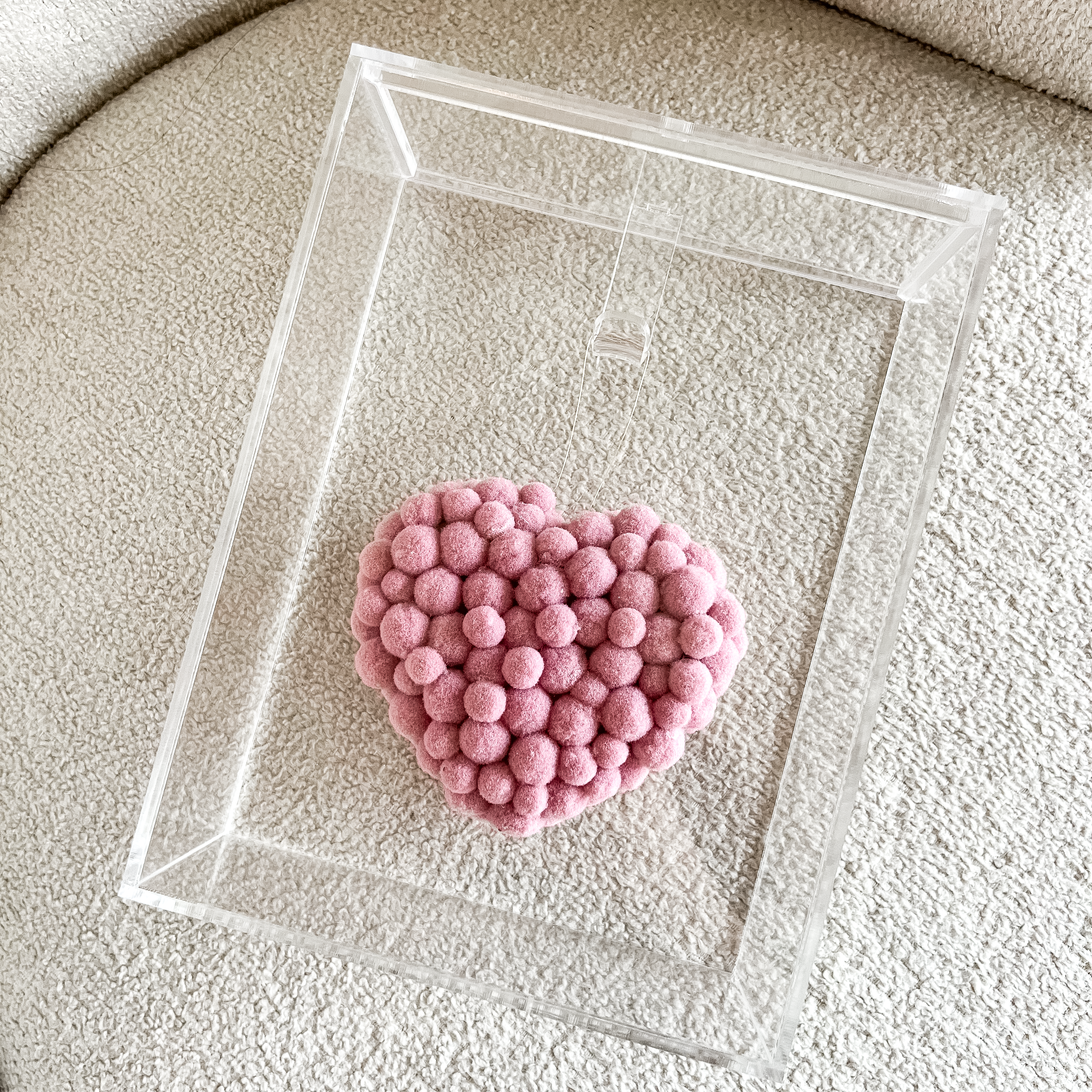 Caixa Acrílica c/ Coração Rosa Claro Pelúcia - 21x16cm