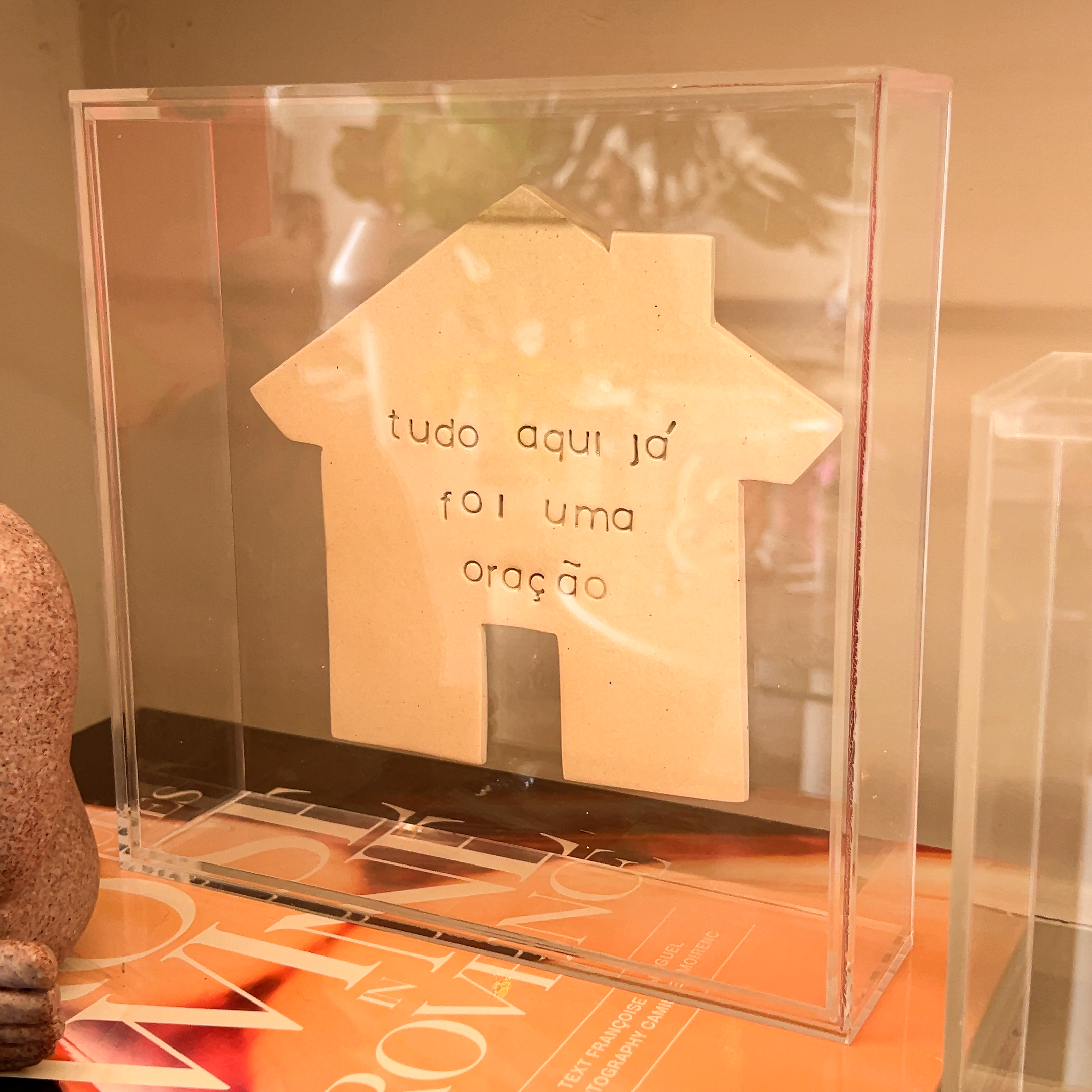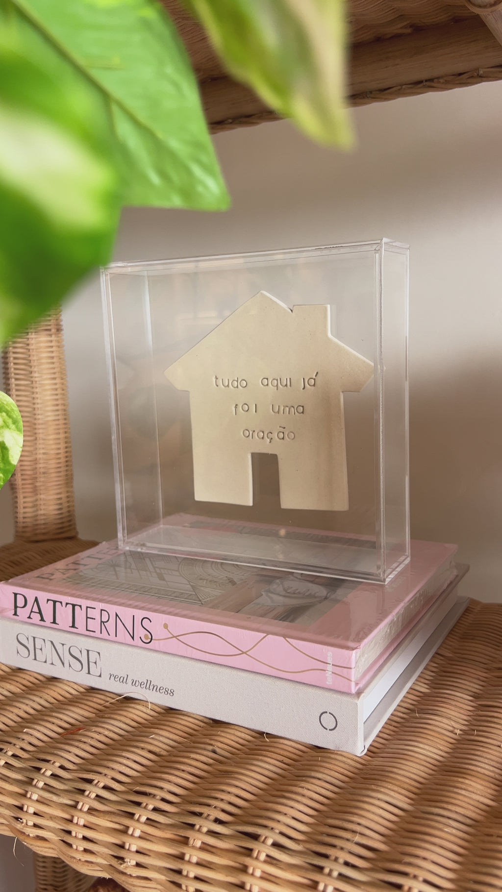 Produto: Caixa Acrílica com Relicário Decorativo Casinha – “Tudo Aqui Já Foi uma Oração”