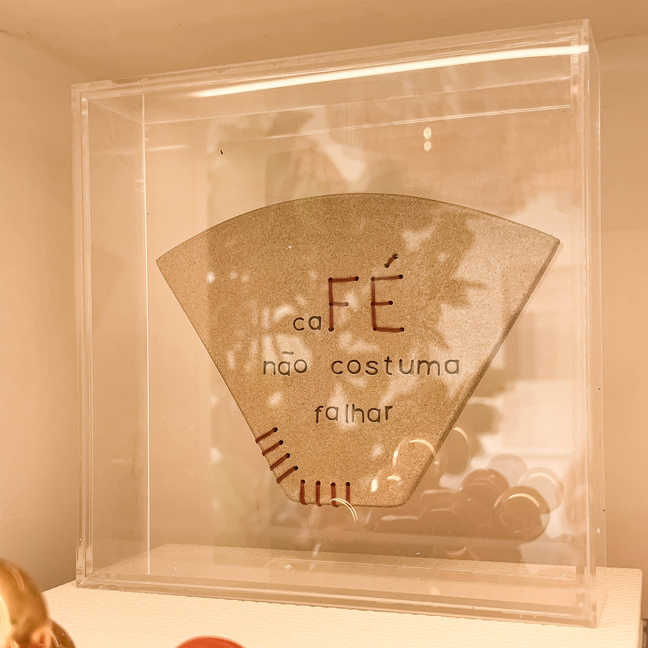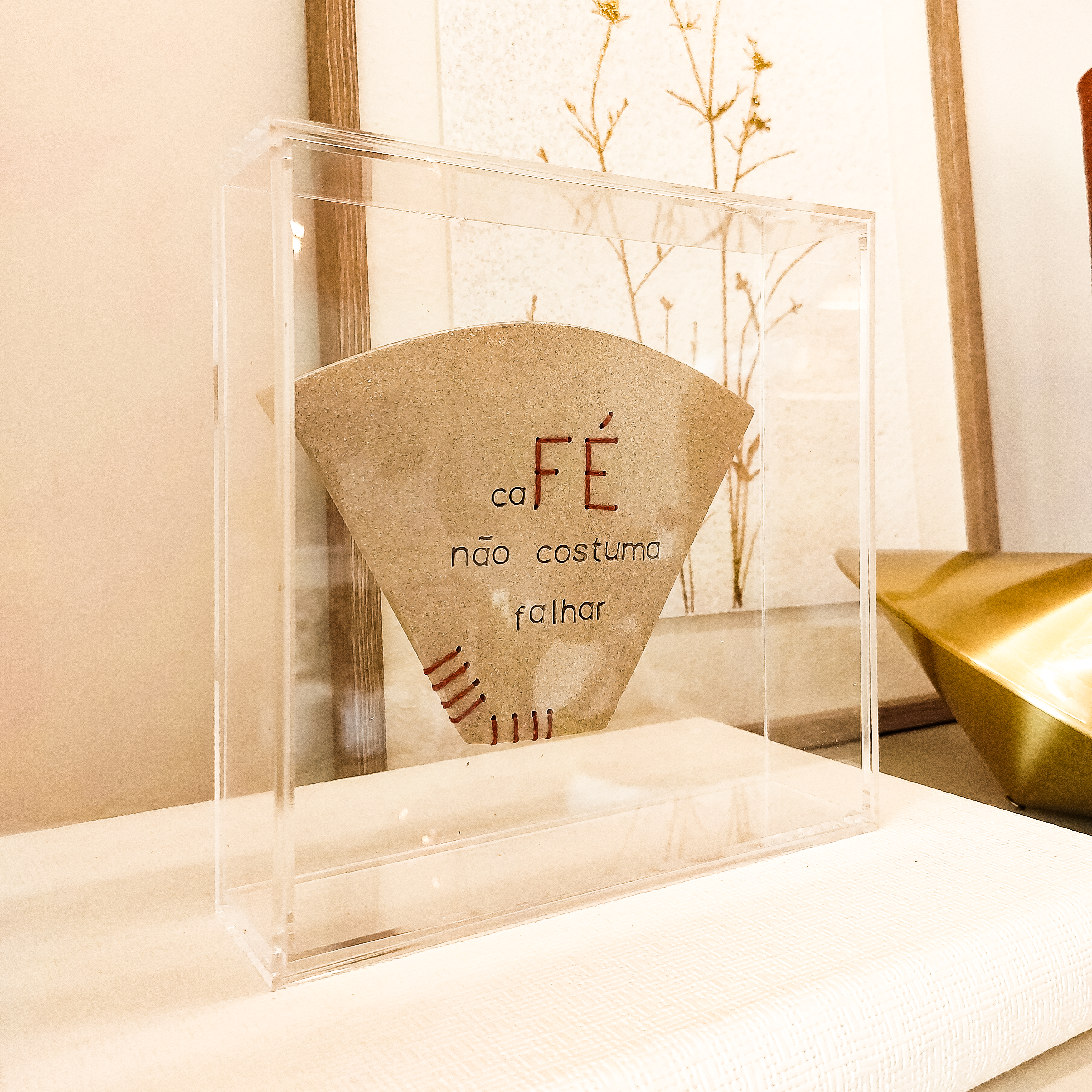 Produto: Caixa Acrílica com Relicário Decorativo Coador – “CaFÉ não costuma falhar”