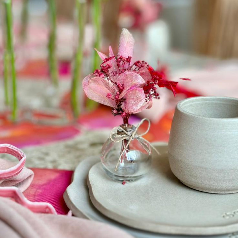 O Mini Vaso com Arranjinho Rosa é um detalhe delicado que transforma qualquer espaço com charme e suavidade. Com flores desidratadas em tons de rosa cuidadosamente compostas, ele traz um toque romântico e acolhedor à decoração, sendo perfeito para mesas postas, aparadores, criados-mudos e lembrancinhas especiais.