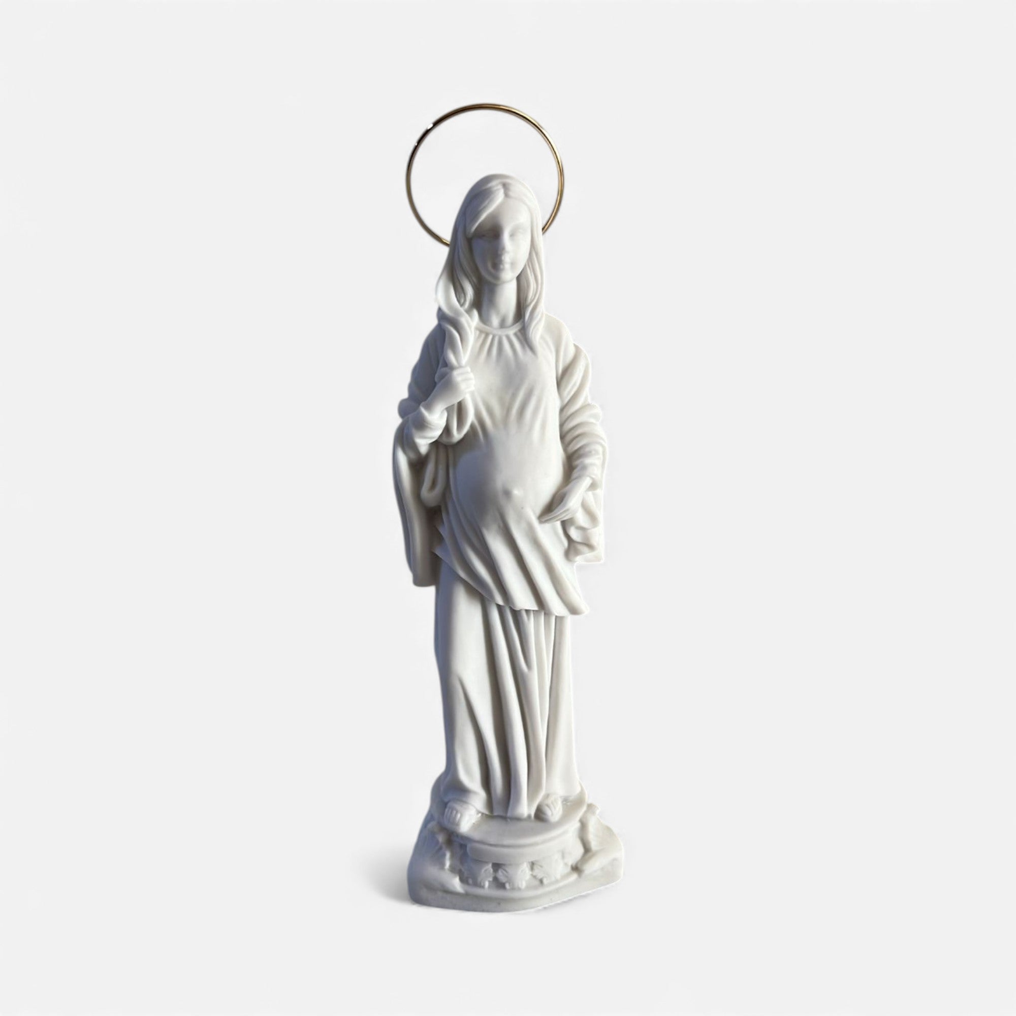 A Imagem Nossa Senhora Grávida celebra o amor materno e a vida, simbolizando a espera divina com delicados detalhes dourados.