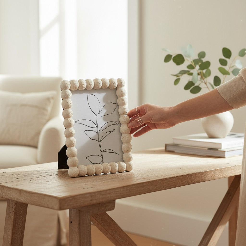 Porta-retrato elegante com moldura de esferas em poliresina natural. Combina perfeitamente com estilos de decoração contemporâneos e neutros.