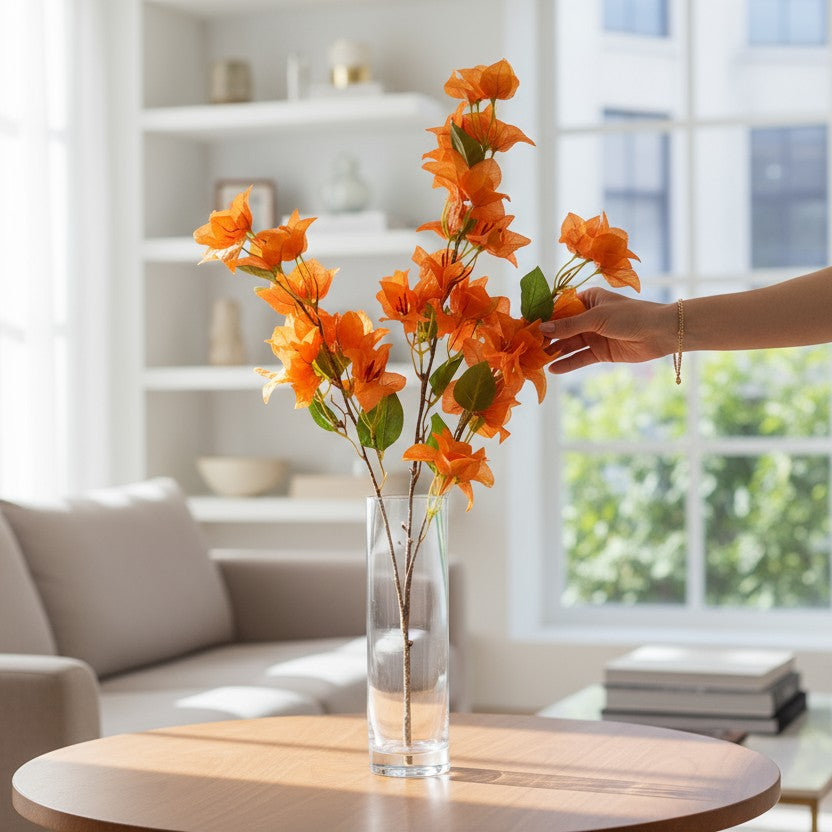 Vibrante e realista, a Haste Bougainvillea Laranja traz o charme tropical das flores exuberantes com acabamento toque real. Ideal para vasos altos, arranjos e composições coloridas.