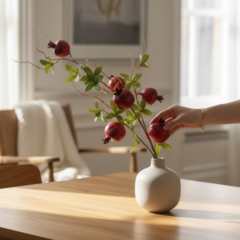 Com aparência realista e cor intensa, a Haste Romã Vermelha simboliza prosperidade e alegria. Ideal para arranjos e vasos decorativos de Natal.