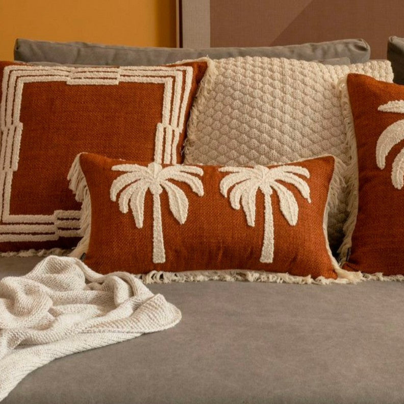 Com um toque rústico e sofisticado, essa almofada em linho terracota traz um delicado bordado de coqueiros em bouclé cru, adicionando textura e elegância ao ambiente.