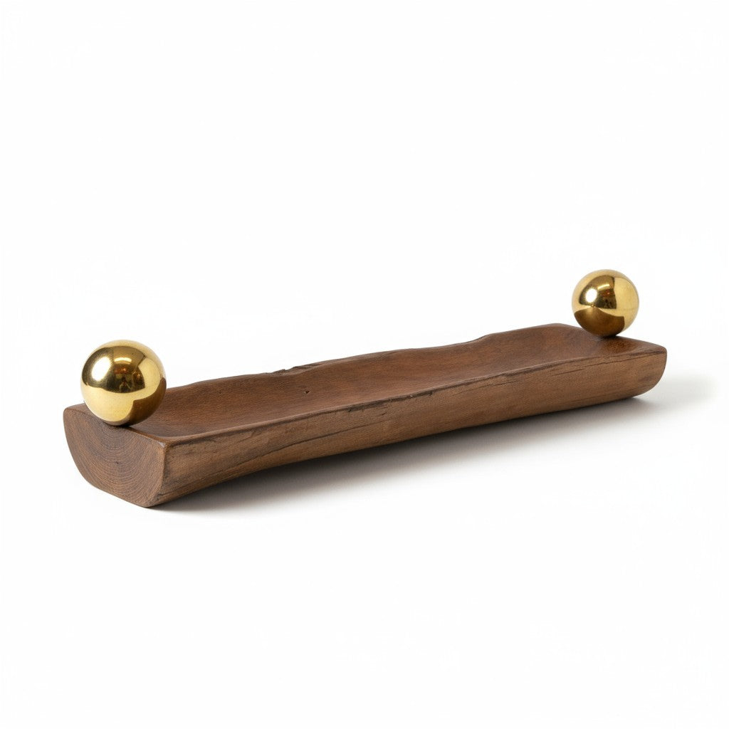 Esta bandeja retangular combina o charme do dourado com a textura natural da madeira. As esferas douradas aplicadas nas bordas conferem sofisticação e brilho na medida certa. Ideal para decorar mesas de centro, buffets ou lavabos com elegância e requinte.