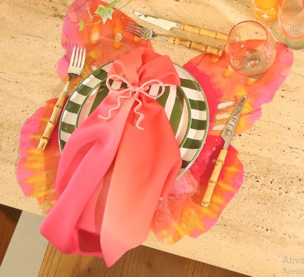 Charmoso e versátil, o lugar americano em formato de borboleta combina o rosa e o laranja em um design exclusivo. Além de proteger a mesa, é um destaque decorativo que transforma qualquer refeição em uma ocasião especial.